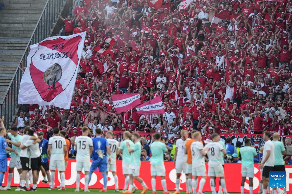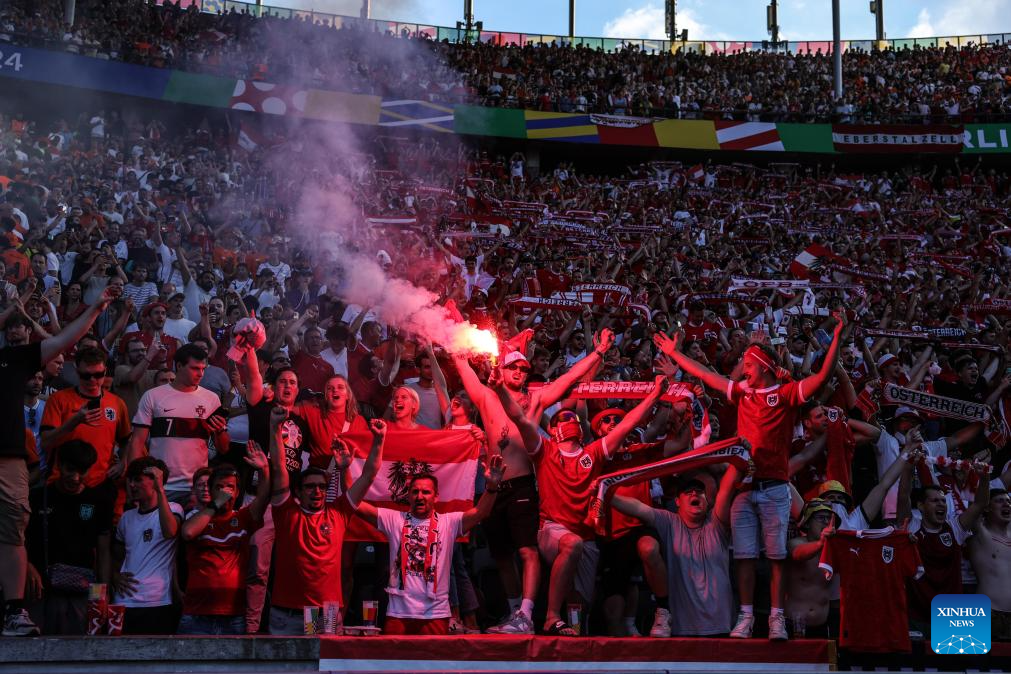 BERLIN, 26 junio, 2024 (Xinhua) -- Imagen del 25 de junio de 2024 de aficionados de Austria, festejando la victoria al término del partido correspondiente al Grupo D de la EURO 2024 de la UEFA, entre Países Bajos y Austria, en Berlín, Alemania. (Xinhua/Pan Yulong)