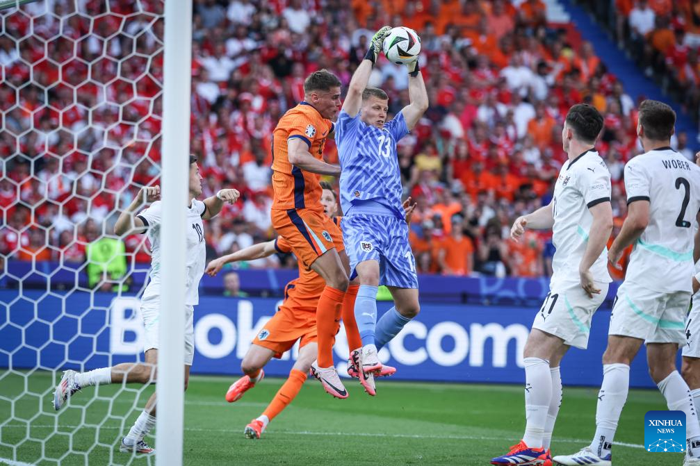 BERLIN, 26 junio, 2024 (Xinhua) -- Imagen del 25 de junio de 2024 del guardameta Patrick Pentz (3-d), de Austria, atajando el balón durante el partido correspondiente al Grupo D de la EURO 2024 de la UEFA, entre Países Bajos y Austria, en Berlín, Alemania. (Xinhua/Pan Yulong)
