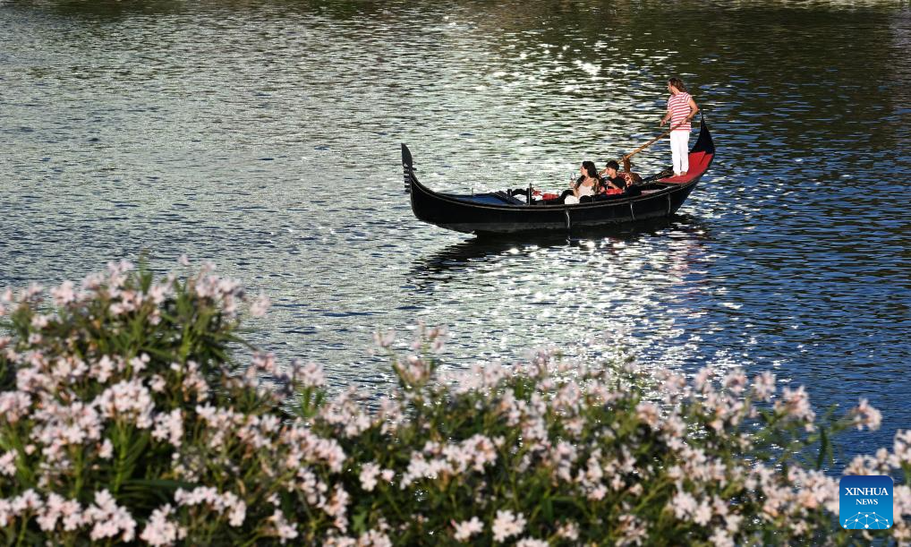 ROMA, 28 junio, 2024 (Xinhua) -- Imagen del 26 de junio de 2024 de personas navegando en una góndola, un tradicional bote de remos típico de Venecia, en un lago, en Roma, Italia. (Xinhua/Alberto Lingria)