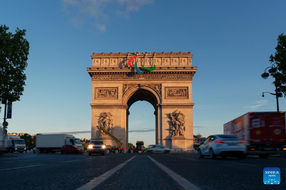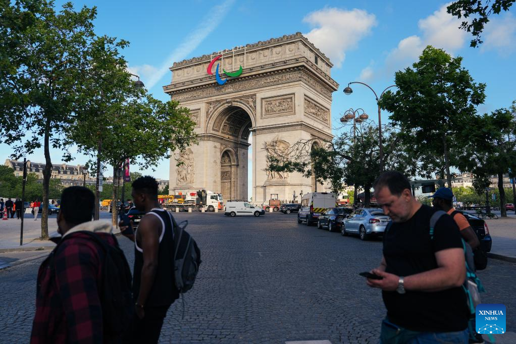 PARIS, 28 junio, 2024 (Xinhua) -- El símbolo de los Juegos Paralímpicos, los Agitos, es visto en el Arco del Triunfo, en París, Francia, el 28 de junio de 2024. (Xinhua/Xu Chang)