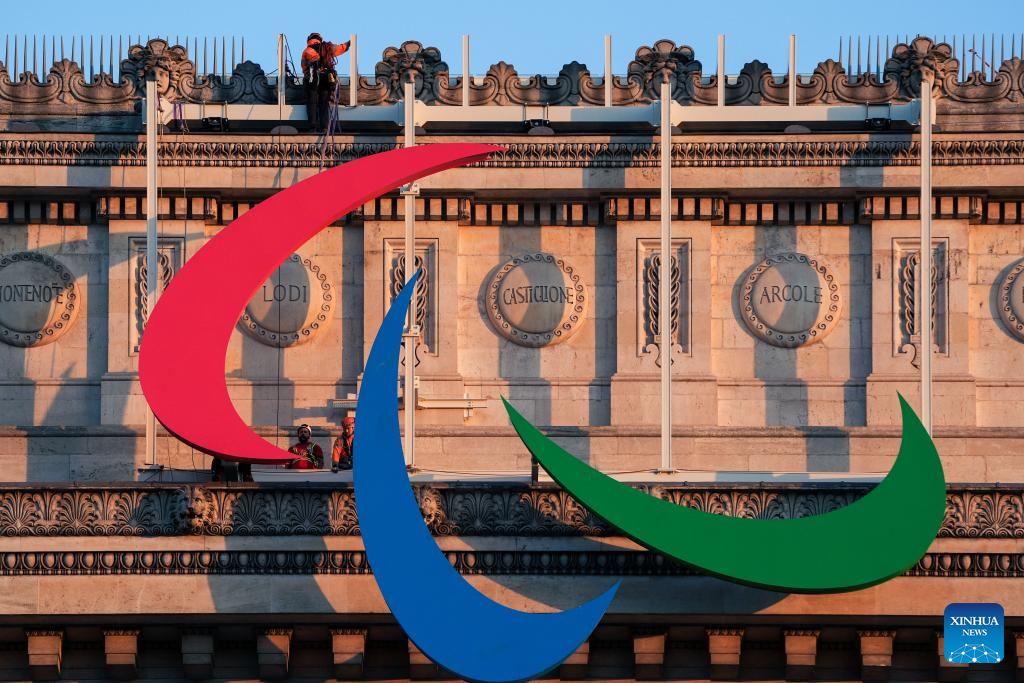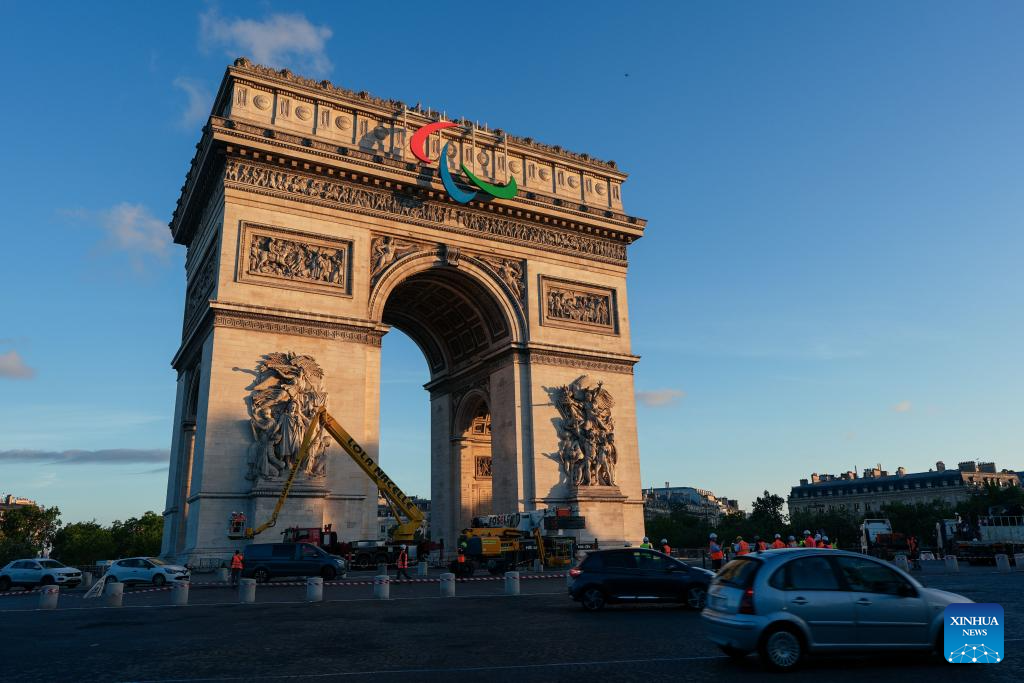 PARIS, 28 junio, 2024 (Xinhua) -- Trabajadores laboran en la colocación del símbolo de los Juegos Paralímpicos, los Agitos, en el Arco del Triunfo, en París, Francia, el 28 de junio de 2024. (Xinhua/Xu Chang)