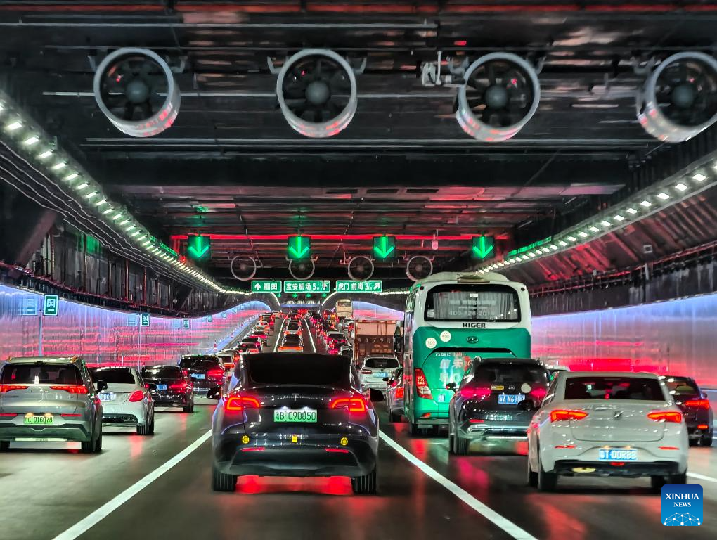 Vehículos son vistos en el túnel submarino del enlace Shenzhen-Zhongshan, en la provincia de Guangdong, en el sur de China, el 30 de junio de 2024. El enlace Shenzhen-Zhongshan, un mega paso transmarino en el sur de China que cuenta con dos puentes, dos islas artificiales y un túnel submarino, se abrió al tráfico a las 15:00 horas del domingo. Con una extensión de 24 kilómetros, la obra reduce considerablemente el tiempo de viaje entre la ciudad de Zhongshan y el centro tecnológico de Shenzhen, situados en lados opuestos del estuario del río de la Perla en la provincia de Guangdong, reduciendo la duración del recorrido de dos horas a unos 30 minutos. (Xinhua/Liu Dawei)
