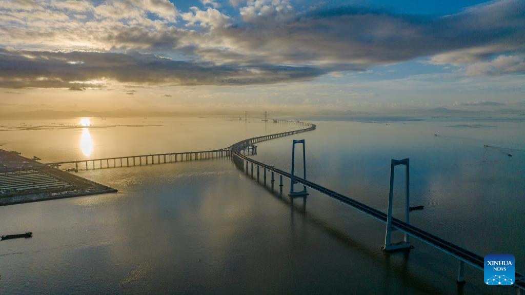 Vista aérea tomada con un dron el 27 de junio de 2024 del enlace Shenzhen-Zhongshan al amanecer, en la provincia de Guangdong, en el sur de China. El enlace Shenzhen-Zhongshan, un mega paso transmarino en el sur de China que cuenta con dos puentes, dos islas artificiales y un túnel submarino, se abrió al tráfico a las 15:00 horas del domingo. Con una extensión de 24 kilómetros, la obra reduce considerablemente el tiempo de viaje entre la ciudad de Zhongshan y el centro tecnológico de Shenzhen, situados en lados opuestos del estuario del río de la Perla en la provincia de Guangdong, reduciendo la duración del recorrido de dos horas a unos 30 minutos. (Xinhua/Mao Siqian)