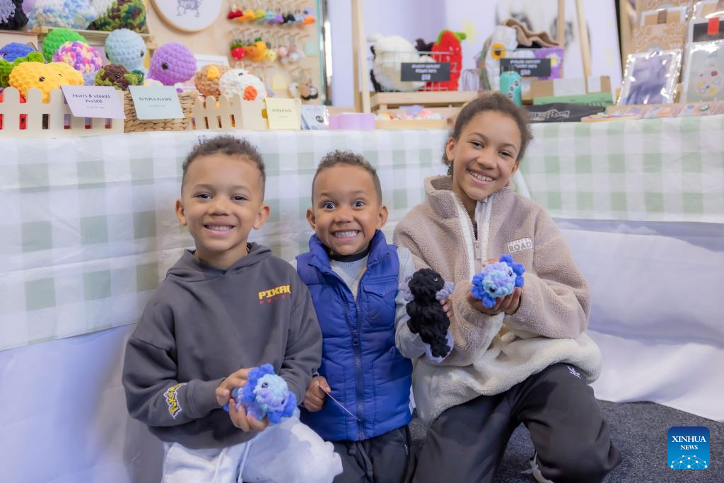 CANBERRA, 29 junio, 2024 (Xinhua) -- Niños muestran juguetes en el Mercado Artesanal de Canberra 2024 en el Parque de Exposiciones, en Canberra, Australia, el 29 de junio de 2024. (Xinhua/Chu Chen)