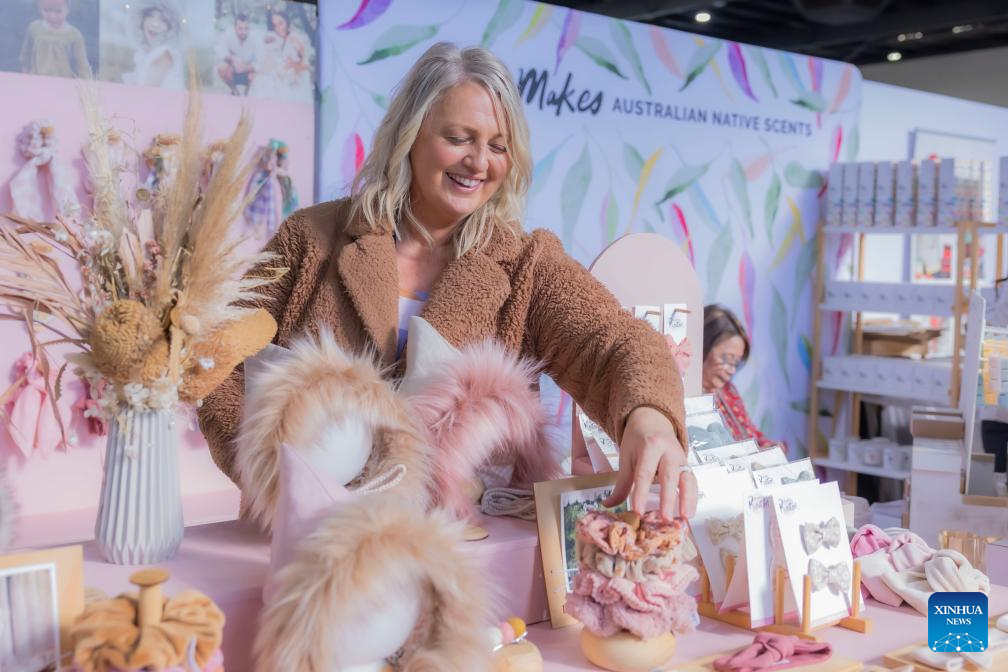 CANBERRA, 29 junio, 2024 (Xinhua) -- Una vendedora organiza productos en el Mercado Artesanal de Canberra 2024 en el Parque de Exposiciones, en Canberra, Australia, el 29 de junio de 2024. (Xinhua/Chu Chen)