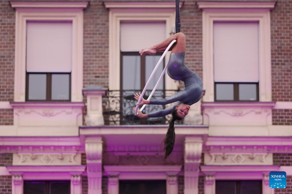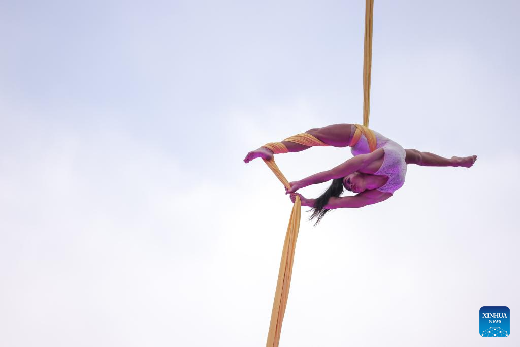 LIUBLIANA, 30 junio, 2024 (Xinhua) -- Imagen del 29 de junio de 2024 de una trampolinista realizando una presentación durante un evento de trampolín en el río Ljubljanica, en Liubliana, Eslovenia. (Xinhua/Zeljko Stevanic)