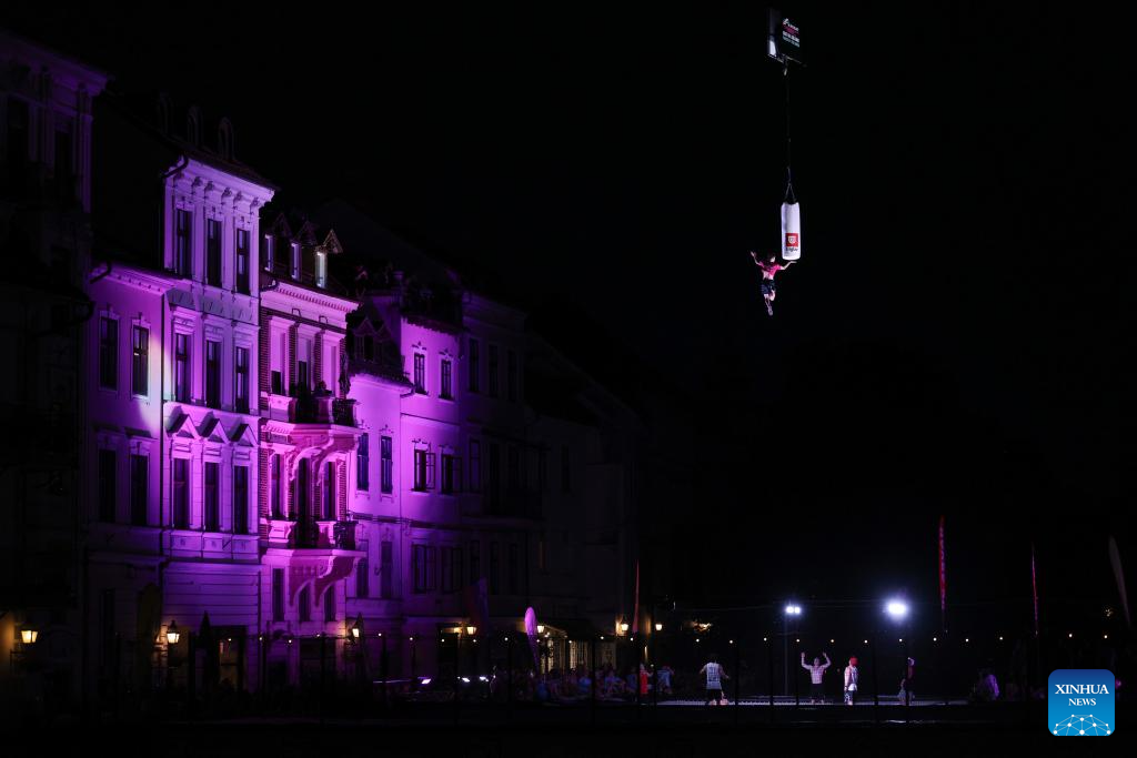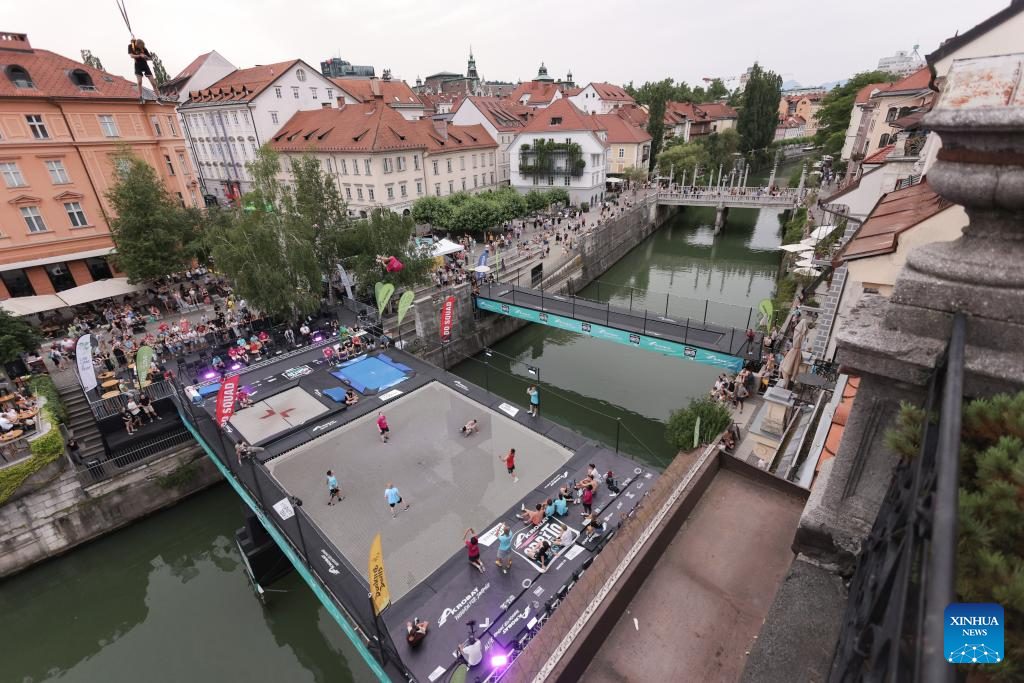 LIUBLIANA, 30 junio, 2024 (Xinhua) -- Imagen del 29 de junio de 2024 de trampolinistas realizando una presentación durante un evento de trampolín en el río Ljubljanica, en Liubliana, Eslovenia. (Xinhua/Zeljko Stevanic)