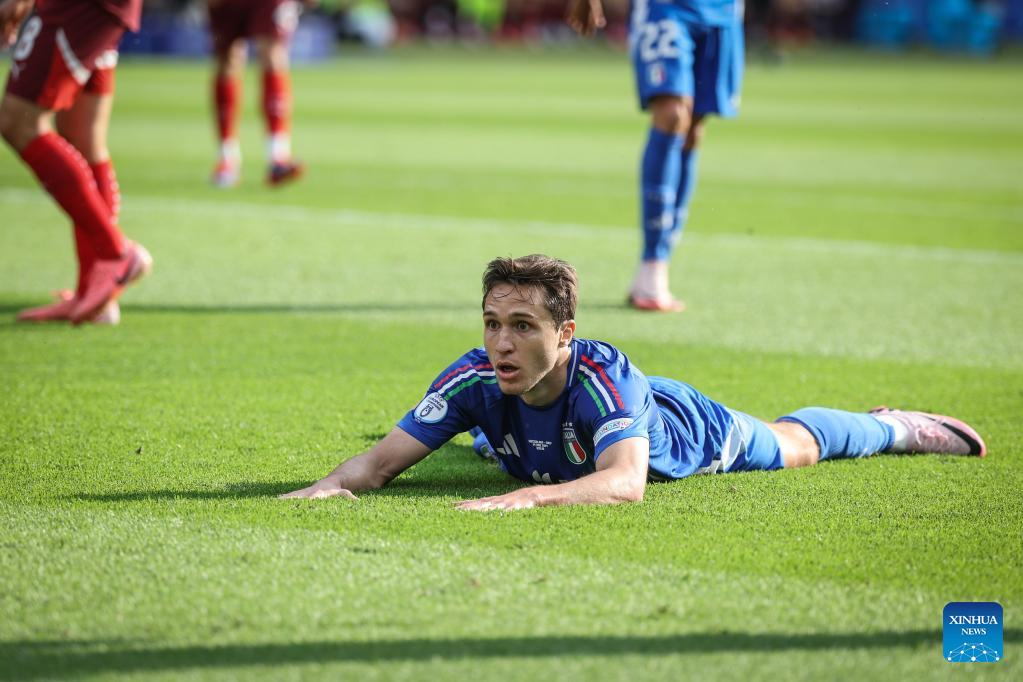 BERLIN, 30 junio, 2024 (Xinhua) -- Imagen del 29 de junio de 2024 de Federico Chiesa, de Italia, reaccionando después de disparar el balón durante el partido correspondiente a los octavos de final de la EURO 2024 de la UEFA, entre Suiza e Italia, en Berlín, Alemania. (Xinhua/Pan Yulong)