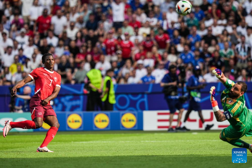 BERLIN, 30 junio, 2024 (Xinhua) -- Imagen del 29 de junio de 2024 de Breel Donald Embolo (i), de Suiza, disparando el balón durante el partido correspondiente a los octavos de final de la EURO 2024 de la UEFA, entre Suiza e Italia, en Berlín, Alemania. (Xinhua/Peng Ziyang)