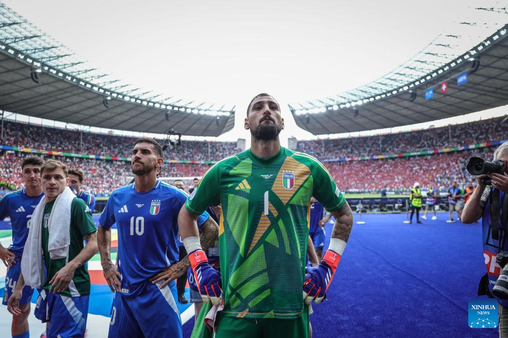BERLIN, 30 junio, 2024 (Xinhua) -- Imagen del 29 de junio de 2024 del guardameta Gianluigi Donnarumma (c), de Italia, saludando a los espectadores al término del partido correspondiente a los octavos de final de la EURO 2024 de la UEFA, entre Suiza e Italia, en Berlín, Alemania. (Xinhua/Pan Yulong)