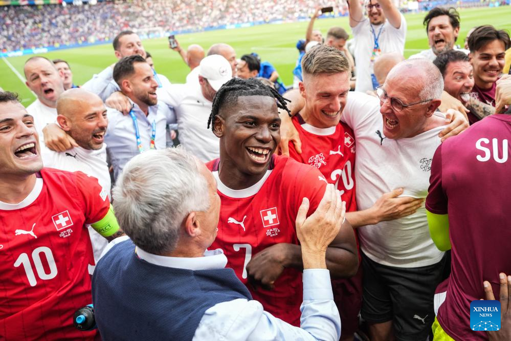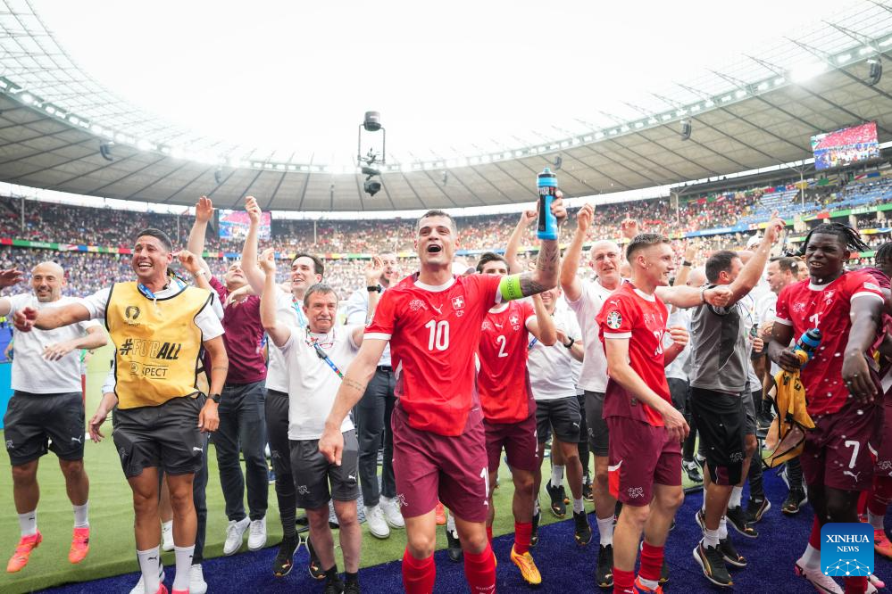 BERLIN, 30 junio, 2024 (Xinhua) -- Imagen del 29 de junio de 2024 de jugadores de la selección nacional de Suiza festejando después de ganar el partido correspondiente a los octavos de final de la EURO 2024 de la UEFA, entre Suiza e Italia, en Berlín, Alemania. (Xinhua/Peng Ziyang)