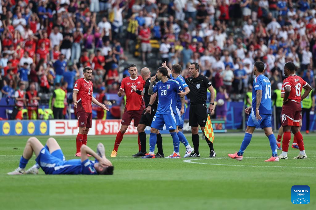 BERLIN, 30 junio, 2024 (Xinhua) -- Imagen del 29 de junio de 2024 de jugadores de ambos equipos discutiendo con los árbitros al término del partido correspondiente a los octavos de final de la EURO 2024 de la UEFA, entre Suiza e Italia, en Berlín, Alemania. (Xinhua/Pan Yulong)