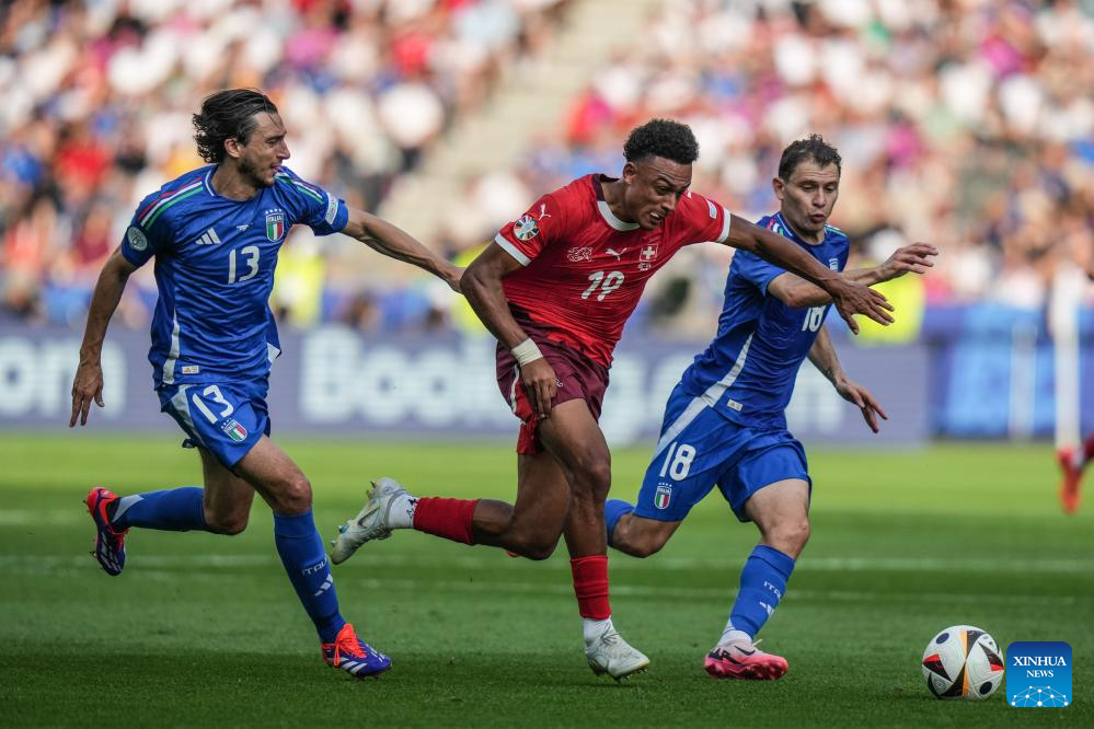 BERLIN, 30 junio, 2024 (Xinhua) -- Imagen del 29 de junio de 2024 de Dan Ndoye (c), de Suiza, abriéndose paso durante el partido correspondiente a los octavos de final de la EURO 2024 de la UEFA, entre Suiza e Italia, en Berlín, Alemania. (Xinhua/Peng Ziyang)
