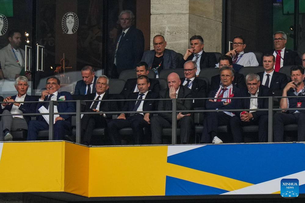 BERLIN, 30 junio, 2024 (Xinhua) -- Imagen del 29 de junio de 2024 del presidente de la FIFA, Gianni Infantino (4-d), observando el partido correspondiente a los octavos de final de la EURO 2024 de la UEFA, entre Suiza e Italia, en Berlín, Alemania. (Xinhua/Peng Ziyang)