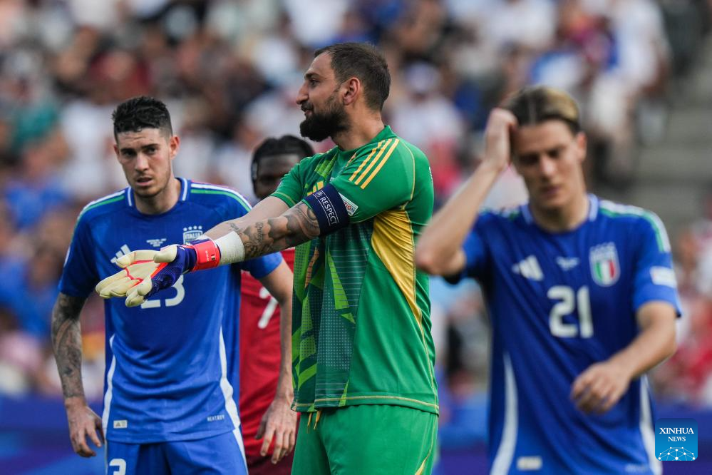 BERLIN, 30 junio, 2024 (Xinhua) -- Imagen del 29 de junio de 2024 del guardameta Gianluigi Donnarumma (c), de Italia, quejándose con el árbitro durante el partido correspondiente a los octavos de final de la EURO 2024 de la UEFA, entre Suiza e Italia, en Berlín, Alemania. (Xinhua/Peng Ziyang)