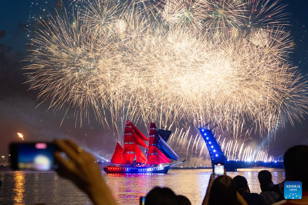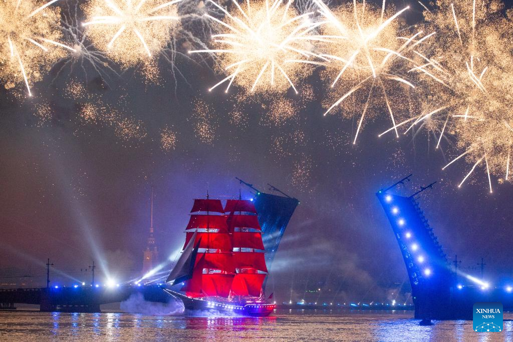 SAN PETERSBURGO, 29 junio, 2024 (Xinhua) -- Un barco con velas escarlata es visto en el río Neva en celebración del festival de Velas Escarlata, en San Petersburgo, Rusia, el 29 de junio de 2024. La segunda ciudad más grande de Rusia, San Petersburgo, celebró el festival de Velas Escarlata durante el fin de semana mientras se conmemoraba la graduación escolar de los estudiantes. (Xinhua/Irina Motina)
