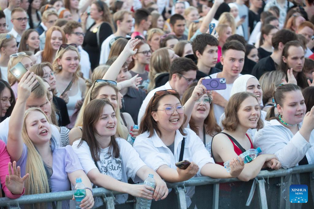 SAN PETERSBURGO, 29 junio, 2024 (Xinhua) -- Imagen del 28 de junio de 2024 de personas disfrutando de un gran concierto en la Plaza del Palacio en celebración del festival de Velas Escarlata, en San Petersburgo, Rusia. La segunda ciudad más grande de Rusia, San Petersburgo, celebró el festival de Velas Escarlata durante el fin de semana mientras se conmemoraba la graduación escolar de los estudiantes. (Xinhua/Irina Motina)