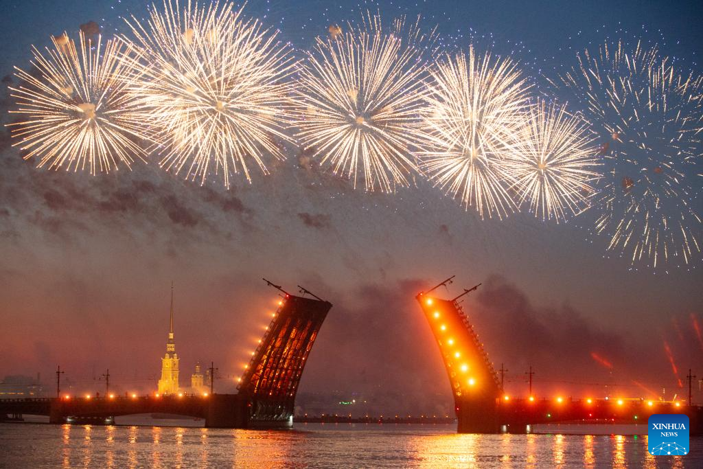SAN PETERSBURGO, 29 junio, 2024 (Xinhua) -- Fuegos artificiales son vistos sobre el río Neva en celebración del festival Velas Escarlata, en San Petersburgo, Rusia, el 29 de junio de 2024. La segunda ciudad más grande de Rusia, San Petersburgo, celebró el festival de Velas Escarlata durante el fin de semana mientras se conmemoraba la graduación escolar de los estudiantes. (Xinhua/Irina Motina)