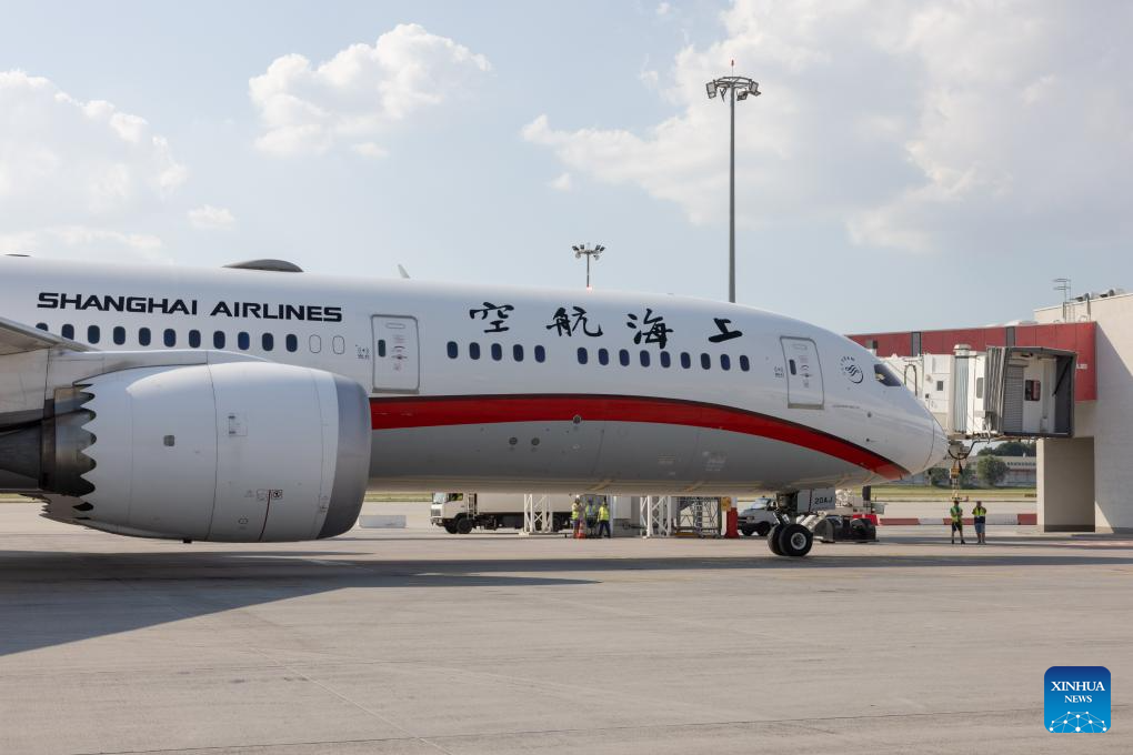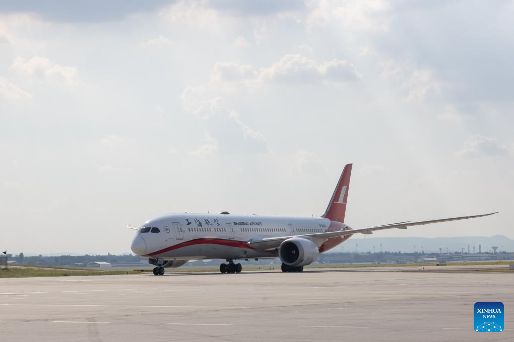 BUDAPEST, 30 junio, 2024 (Xinhua) -- Imagen del 29 de junio de 2024 de un avión procedente de Xi'an, capital de la provincia de Shaanxi, en el noroeste de China, llegando al Aeropuerto Internacional Ferenc Liszt de Budapest, en Budapest, Hungría. Los vuelos directos entre Xi'an, capital de la provincia de Shaanxi, en el noroeste de China, y Budapest se reanudaron el sábado. Con la reanudación del enlace directo entre Xi'an y Budapest, la capital húngara cuenta ahora con siete rutas aéreas directas con China. (Xinhua/Attila Volgyi)