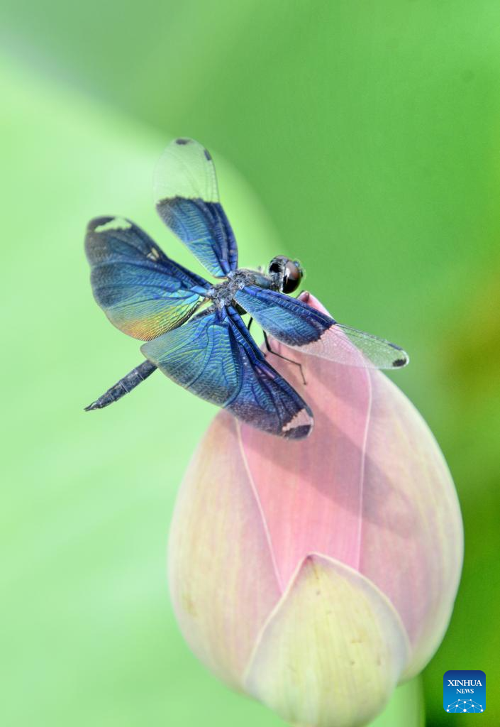 BEIJING, 30 junio, 2024 (Xinhua) -- Una libélula descansa sobre un brote de loto en el parque Yuanmingyuan, en Beijing, capital de China, el 30 de junio de 2024. (Xinhua/Li Xin)