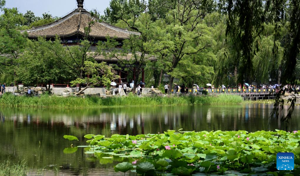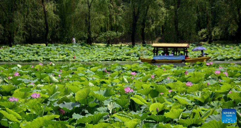BEIJING, 30 junio, 2024 (Xinhua) -- Visitantes disfrutan de flores de loto en el parque Yuanmingyuan, en Beijing, capital de China, el 30 de junio de 2024. (Xinhua/Li Xin)