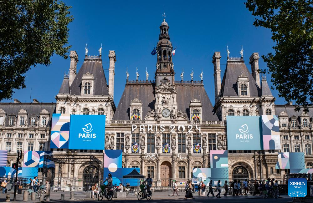 PARIS, 30 junio, 2024 (Xinhua) -- Imagen del 28 de junio de 2024 del Ayuntamiento con decoraciones temáticas de los Juegos Olímpicos y Paralímpicos, en París, Francia. Con menos de 30 días para la ceremonia de apertura, París se encuentra en las últimas fases de preparación para los Juegos Olímpicos de Verano 2024. (Xinhua/Sun Fei)