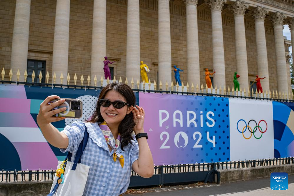 PARIS, 30 junio, 2024 (Xinhua) -- Imagen del 28 de junio de 2024 de una turista posando para fotografías con esculturas y decoraciones temáticas de los Juegos Olímpicos frente a la Asamblea Nacional, en París, Francia. Con menos de 30 días para la ceremonia de apertura, París se encuentra en las últimas fases de preparación para los Juegos Olímpicos de Verano 2024. (Xinhua/Sun Fei)