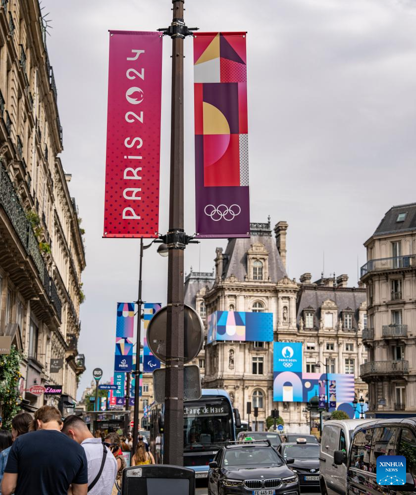 PARIS, 30 junio, 2024 (Xinhua) -- Imagen del 29 de junio de 2024 de decoraciones temáticas de los Juegos Olímpicos y Paralímpicos, cerca del Ayuntamiento, en París, Francia. Con menos de 30 días para la ceremonia de apertura, París se encuentra en las últimas fases de preparación para los Juegos Olímpicos de Verano 2024. (Xinhua/Sun Fei)