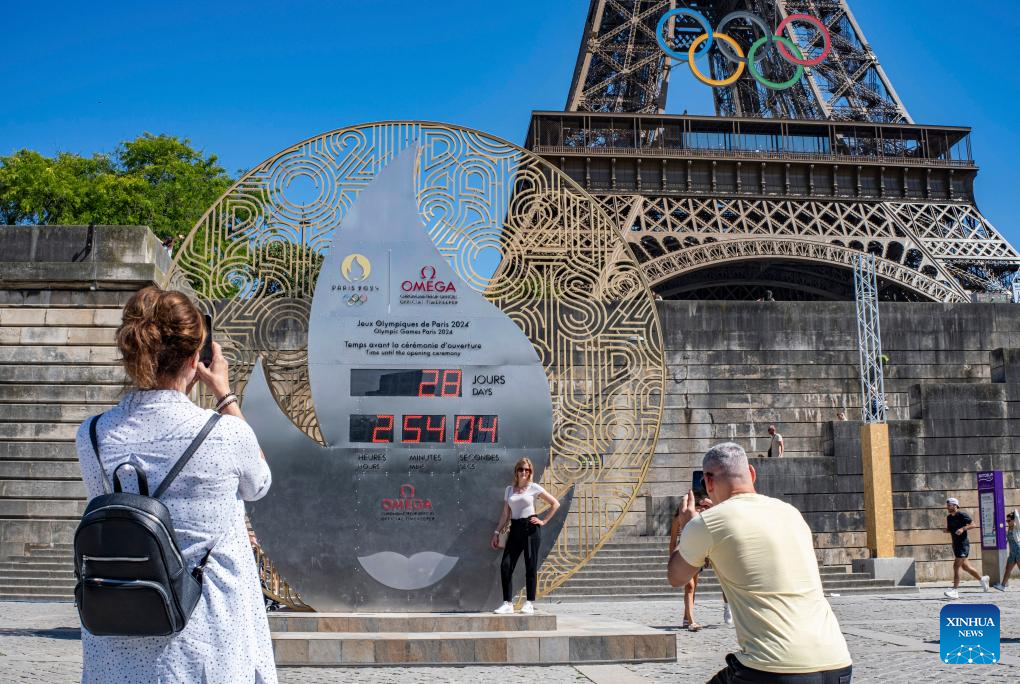 PARIS, 30 junio, 2024 (Xinhua) -- Imagen del 28 de junio de 2024 de una turista posando para fotografías con un reloj de cuenta regresiva para los Juegos Olímpicos 2024 frente a la Torre Eiffel, en París, Francia. Con menos de 30 días para la ceremonia de apertura, París se encuentra en las últimas fases de preparación para los Juegos Olímpicos de Verano 2024. (Xinhua/Sun Fei)