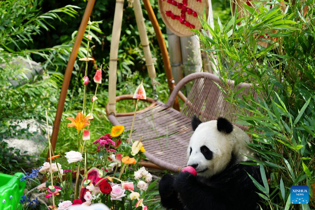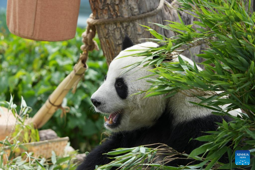 XINING, 30 junio, 2024 (Xinhua) -- Un panda gigante disfruta de alimento en la Casa del Panda de Xining, en Xining, capital de la provincia de Qinghai, en el noroeste de China, el 30 de junio de 2024. (Xinhua/Du Xiaowei)