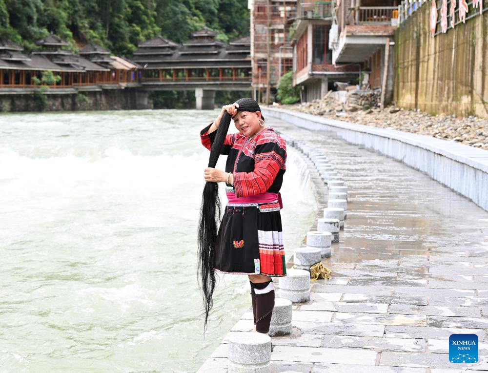 LONGSHENG, 2 julio, 2024 (Xinhua) -- Imagen del 26 de junio de 2024 de la residente Pan Xiuxiang, lavando su cabello junto a un río, en la aldea de Huangluo del distrito de Longsheng, en la región autónoma zhuang de Guangxi, en el sur de China. La aldea de Huangluo, en Guangxi, en el sur de China es famosa por el cabello espectacularmente largo que llevan las mujeres del grupo étnico yao. En los últimos años, la aldea ha intensificado sus esfuerzos para desarrollar la industria del turismo aprovechando sus culturas étnicas, incluidas las tradiciones del tejido de telas, la danza y el cuidado del cabello largo. La aldea recibió alrededor de 274.800 viajes turísticos entre enero y junio de este año. (Xinhua/Jin Haoyuan)