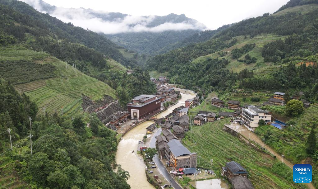 LONGSHENG, 2 julio, 2024 (Xinhua) -- Vista aérea tomada con un dron el 26 de junio de 2024 de la aldea de Huangluo del distrito de Longsheng, en la región autónoma zhuang de Guangxi, en el sur de China. La aldea de Huangluo, en Guangxi, en el sur de China es famosa por el cabello espectacularmente largo que llevan las mujeres del grupo étnico yao. En los últimos años, la aldea ha intensificado sus esfuerzos para desarrollar la industria del turismo aprovechando sus culturas étnicas, incluidas las tradiciones del tejido de telas, la danza y el cuidado del cabello largo. La aldea recibió alrededor de 274.800 viajes turísticos entre enero y junio de este año. (Xinhua/Jin Haoyuan)