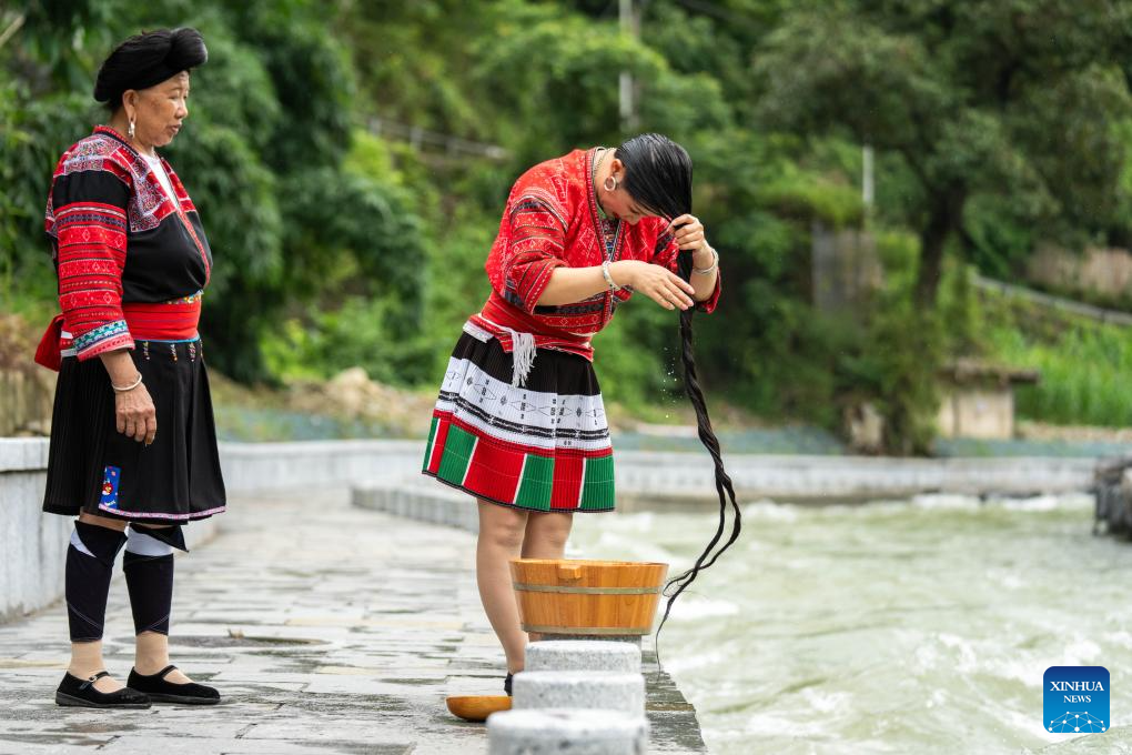 LONGSHENG, 2 julio, 2024 (Xinhua) -- Imagen del 26 de junio de 2024 de la residente Pan Fengfei (d), lavando su cabello junto a un río, en la aldea de Huangluo del distrito de Longsheng, en la región autónoma zhuang de Guangxi, en el sur de China. La aldea de Huangluo, en Guangxi, en el sur de China es famosa por el cabello espectacularmente largo que llevan las mujeres del grupo étnico yao. En los últimos años, la aldea ha intensificado sus esfuerzos para desarrollar la industria del turismo aprovechando sus culturas étnicas, incluidas las tradiciones del tejido de telas, la danza y el cuidado del cabello largo. La aldea recibió alrededor de 274.800 viajes turísticos entre enero y junio de este año. (Xinhua/Yang Zhisen)