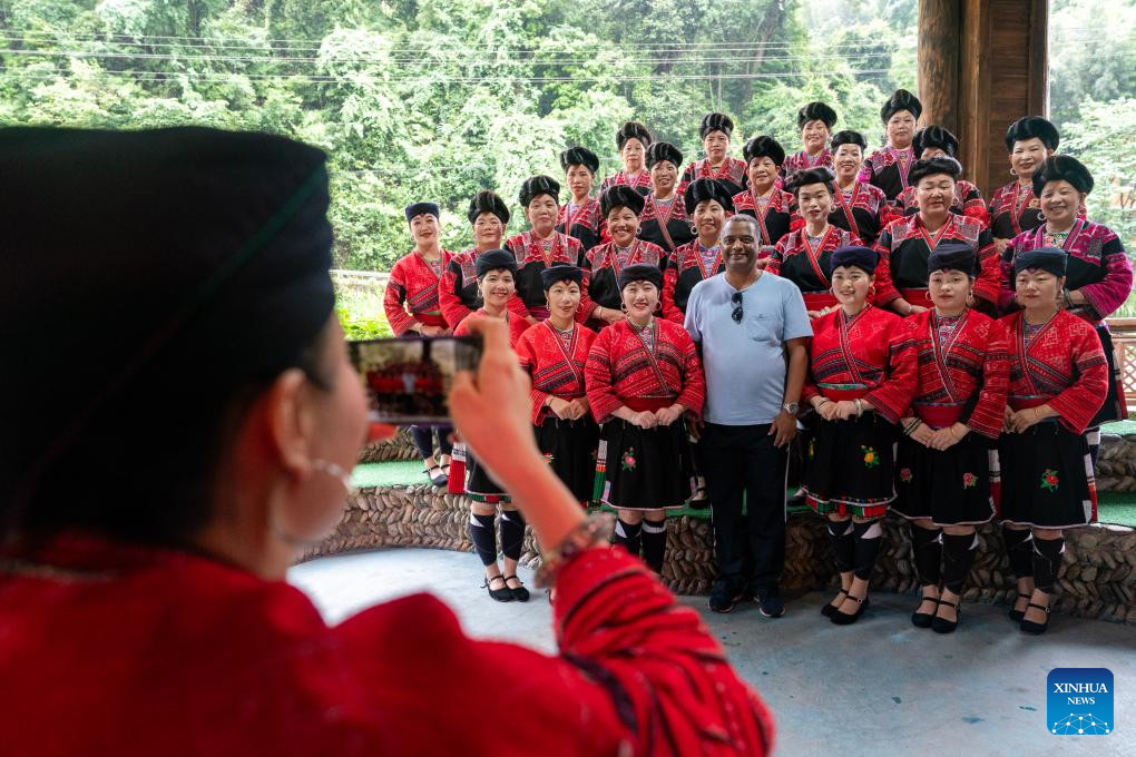 LONGSHENG, 2 julio, 2024 (Xinhua) -- Imagen del 26 de junio de 2024 de un turista etíope posando para fotografías junto a residentes después de una presentación, en la aldea de Huangluo del distrito de Longsheng, en la región autónoma zhuang de Guangxi, en el sur de China. La aldea de Huangluo, en Guangxi, en el sur de China es famosa por el cabello espectacularmente largo que llevan las mujeres del grupo étnico yao. En los últimos años, la aldea ha intensificado sus esfuerzos para desarrollar la industria del turismo aprovechando sus culturas étnicas, incluidas las tradiciones del tejido de telas, la danza y el cuidado del cabello largo. La aldea recibió alrededor de 274.800 viajes turísticos entre enero y junio de este año. (Xinhua/Li Bo)