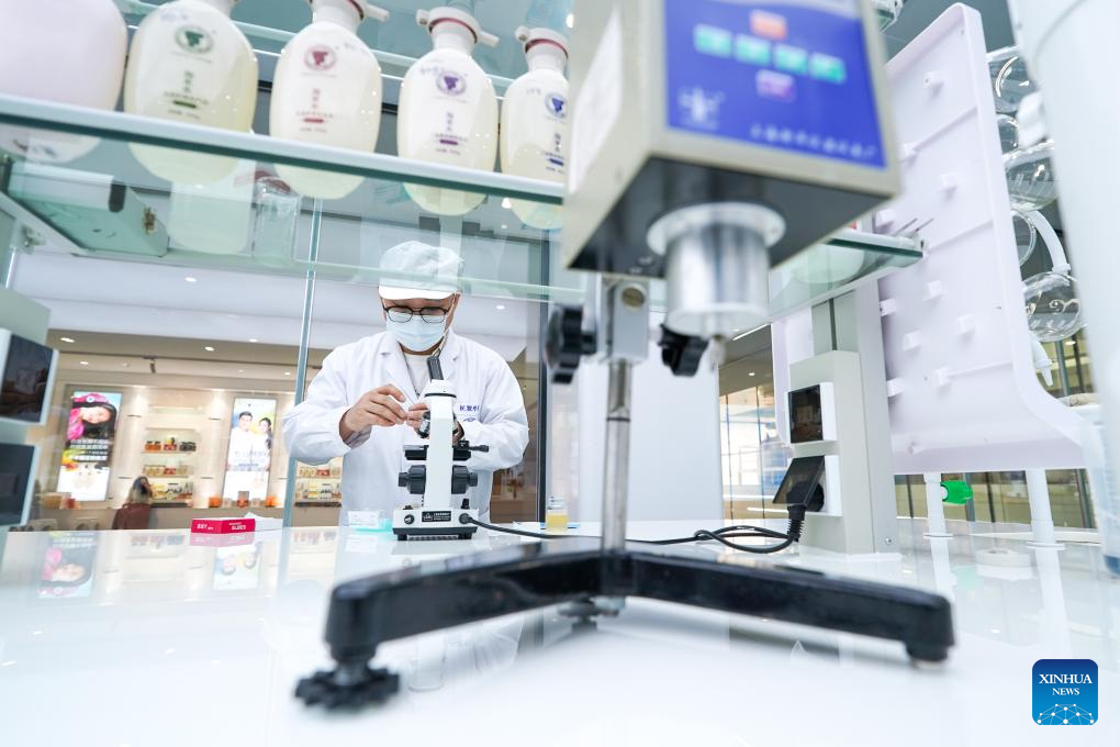 LONGSHENG, 2 julio, 2024 (Xinhua) -- Imagen del 26 de junio de 2024 de un empleado desarrollando variedades de champú en un laboratorio de una compañía de champú, en la aldea de Huangluo del distrito de Longsheng, en la región autónoma zhuang de Guangxi, en el sur de China. La aldea de Huangluo, en Guangxi, en el sur de China es famosa por el cabello espectacularmente largo que llevan las mujeres del grupo étnico yao. En los últimos años, la aldea ha intensificado sus esfuerzos para desarrollar la industria del turismo aprovechando sus culturas étnicas, incluidas las tradiciones del tejido de telas, la danza y el cuidado del cabello largo. La aldea recibió alrededor de 274.800 viajes turísticos entre enero y junio de este año. (Xinhua/Zhang Ailin)