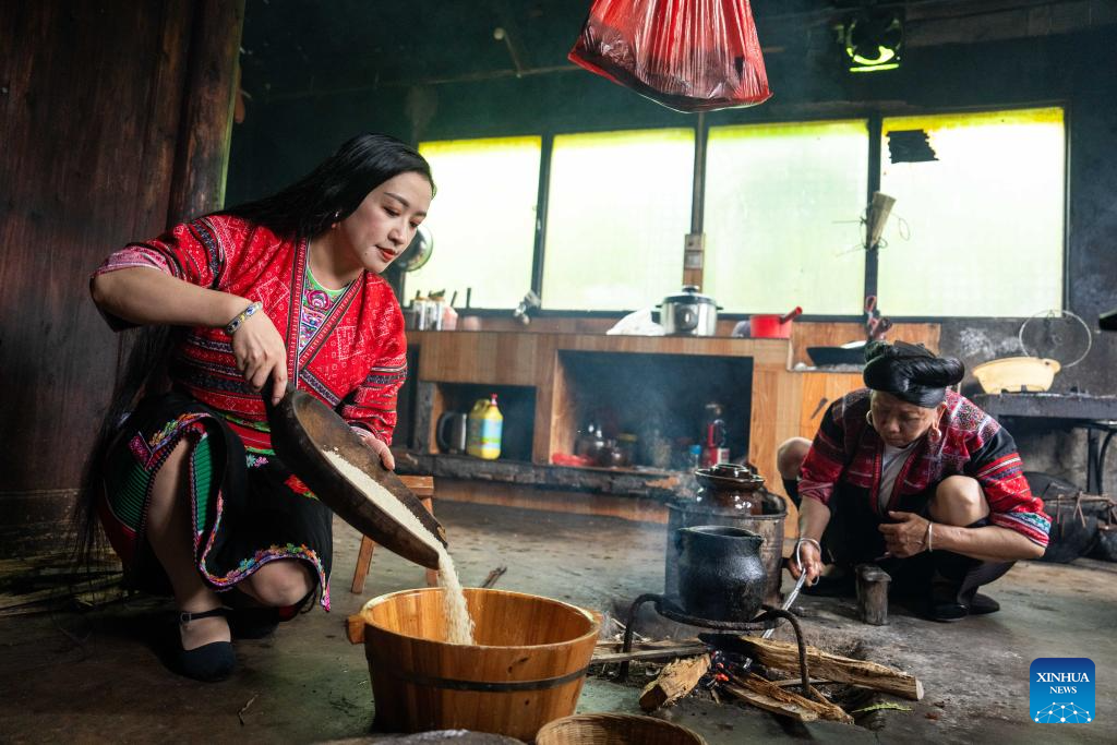 LONGSHENG, 2 julio, 2024 (Xinhua) -- Imagen del 26 de junio de 2024 de la residente Pan Fengfei (i), preparando agua de arroz para el lavado del cabello en su hogar, en la aldea de Huangluo del distrito de Longsheng, en la región autónoma zhuang de Guangxi, en el sur de China. La aldea de Huangluo, en Guangxi, en el sur de China es famosa por el cabello espectacularmente largo que llevan las mujeres del grupo étnico yao. En los últimos años, la aldea ha intensificado sus esfuerzos para desarrollar la industria del turismo aprovechando sus culturas étnicas, incluidas las tradiciones del tejido de telas, la danza y el cuidado del cabello largo. La aldea recibió alrededor de 274.800 viajes turísticos entre enero y junio de este año. (Xinhua/Chen Sihan)