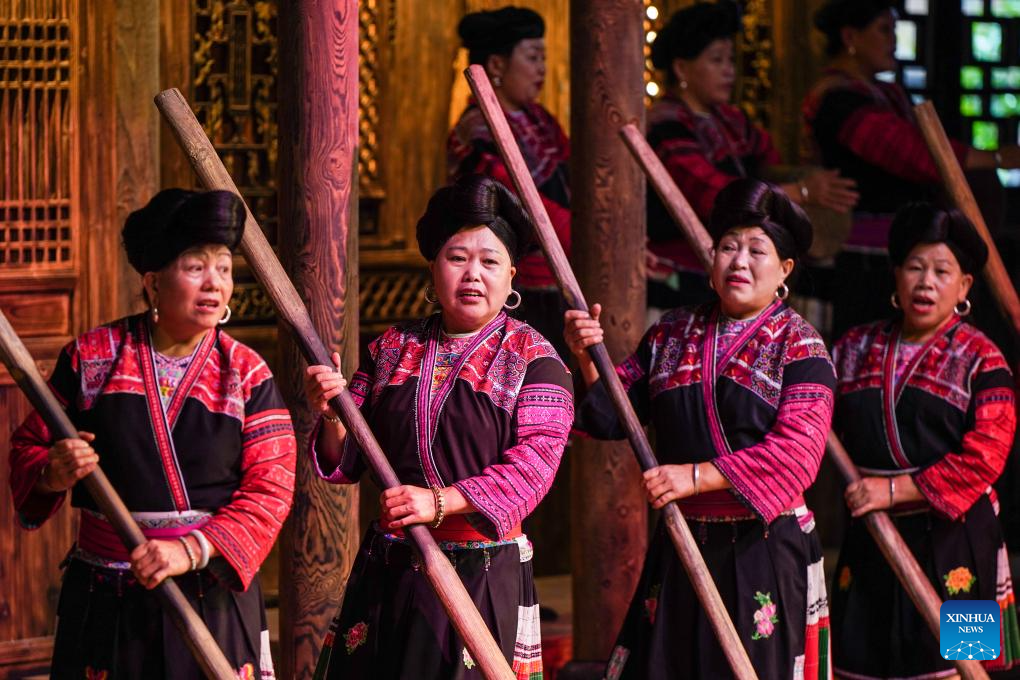 LONGSHENG, 2 julio, 2024 (Xinhua) -- Imagen del 26 de junio de 2024 de residentes realizando una presentación, en la aldea de Huangluo del distrito de Longsheng, en la región autónoma zhuang de Guangxi, en el sur de China. La aldea de Huangluo, en Guangxi, en el sur de China es famosa por el cabello espectacularmente largo que llevan las mujeres del grupo étnico yao. En los últimos años, la aldea ha intensificado sus esfuerzos para desarrollar la industria del turismo aprovechando sus culturas étnicas, incluidas las tradiciones del tejido de telas, la danza y el cuidado del cabello largo. La aldea recibió alrededor de 274.800 viajes turísticos entre enero y junio de este año. (Xinhua/Li Bo)