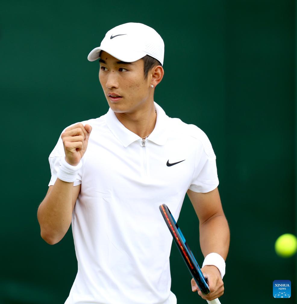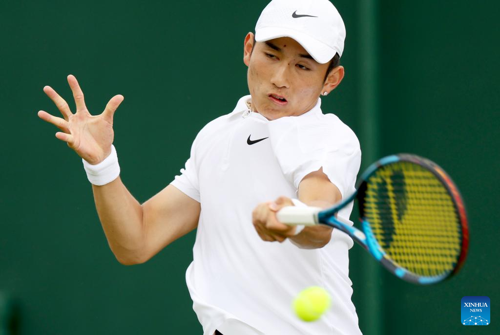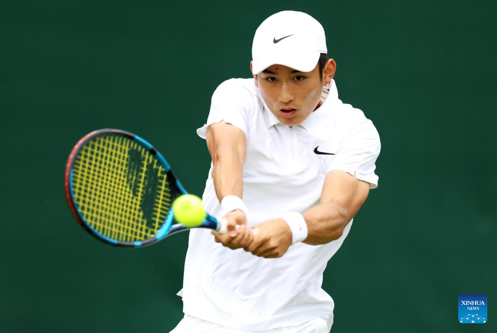 LONDRES, 1 julio, 2024 (Xinhua) -- Shang Juncheng devuelve la pelota durante el partido de la primera ronda de individuales masculinos entre Shang Juncheng, de China, y Cristian Garín, de Chile, en el Campeonato de Tenis de Wimbledon, en Londres, Reino Unido, el 1 de julio de 2024. (Xinhua/Li Ying)