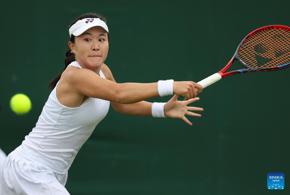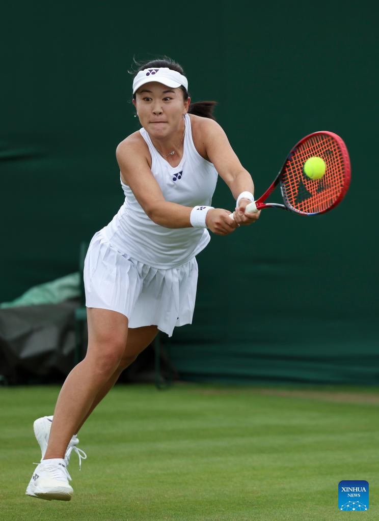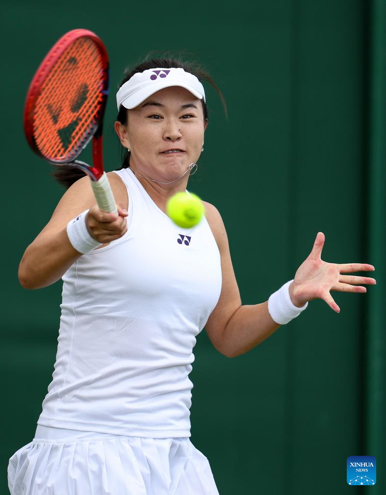 LONDRES, 1 julio, 2024 (Xinhua) -- Zhu Lin devuelve la pelota durante el partido de la primera ronda de individuales femeninos entre Zhu Lin, de China, e Irina-Camelia Begu, de Rumania, en el Campeonato de Tenis de Wimbledon, en Londres, Reino Unido, el 1 de julio de 2024. (Xinhua/Han Yan)
