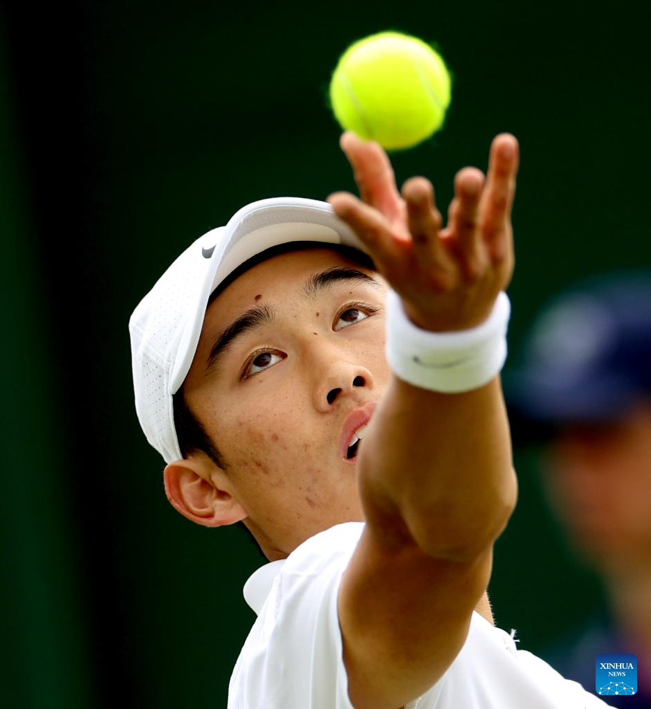LONDRES, 1 julio, 2024 (Xinhua) -- Shang Juncheng sirve la pelota durante el partido de la primera ronda de individuales masculinos entre Shang Juncheng, de China, y Cristian Garín, de Chile, en el Campeonato de Tenis de Wimbledon, en Londres, Reino Unido, el 1 de julio de 2024. (Xinhua/Li Ying)