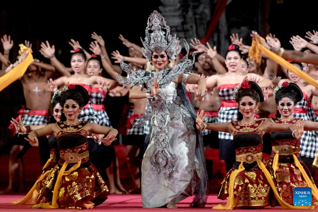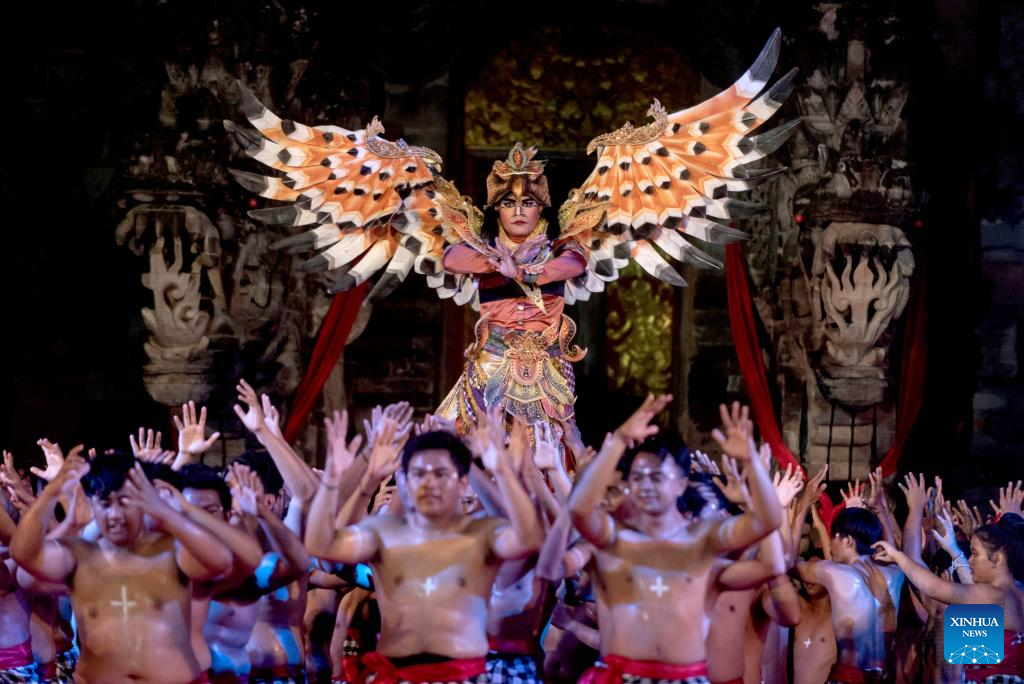 BALI, 1 julio, 2024 (Xinhua) -- Imagen del 30 de junio de 2024 de bailarines realizando una presentación de la danza Kecak durante el Festival de Artes de Bali 2024 en el Parque Cultural Garuda Wisnu Kencana, en Bali, Indonesia. El Festival de Artes de Bali de este año se celebra del 15 de junio al 13 de julio. (Xinhua/Dicky Bisinglasi)