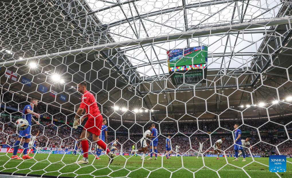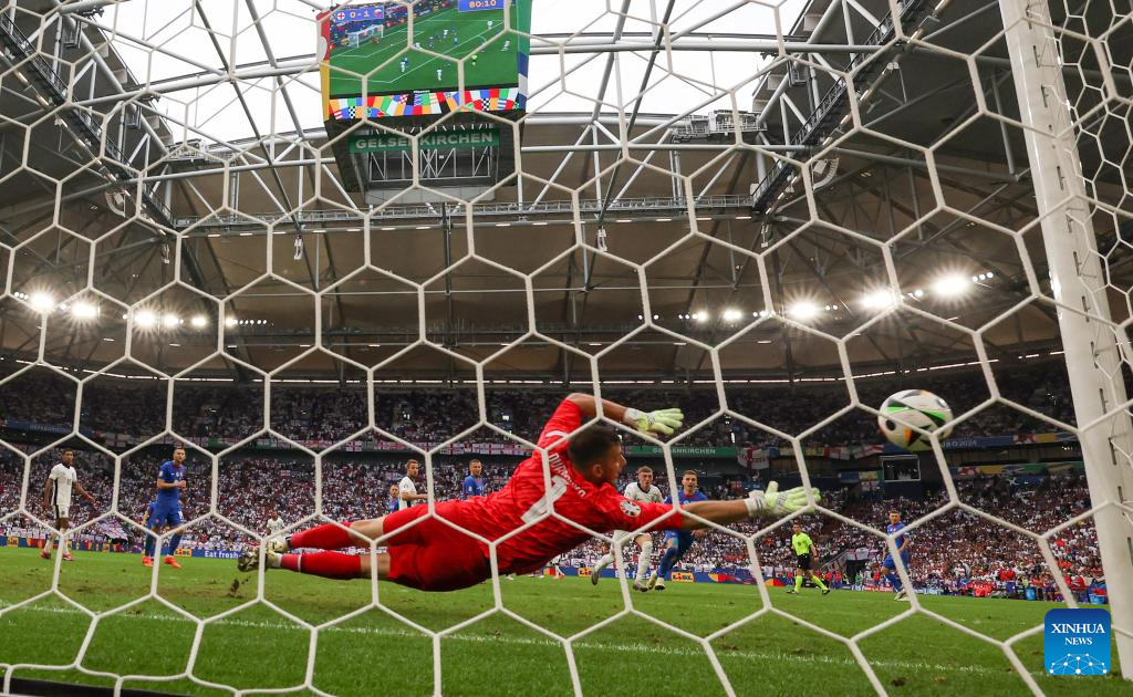 GELSENKIRCHEN, 1 julio, 2024 (Xinhua) -- Imagen del 30 de junio de 2024 del guardameta Martin Dubravka, de Eslovaquia, intentando realizar una atajada durante el partido correspondiente a los octavos de final de la EURO 2024 de la UEFA, entre Inglaterra y Eslovaquia, en Gelsenkirchen, Alemania. (Xinhua/Bai Xuefei)