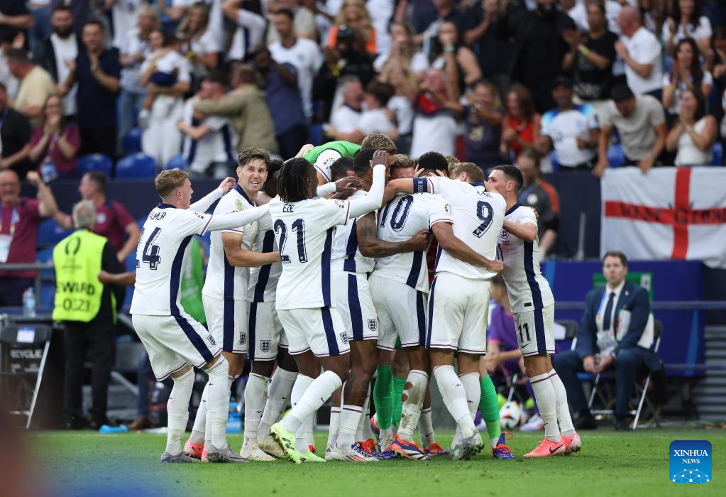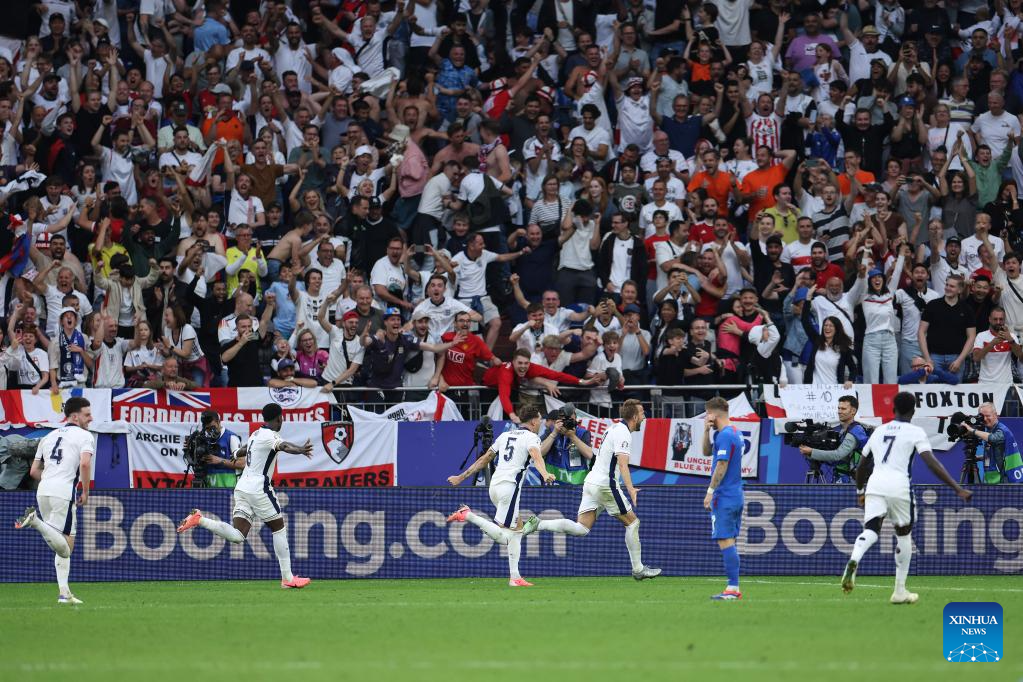 GELSENKIRCHEN, 1 julio, 2024 (Xinhua) -- Imagen del 30 de junio de 2024 de Harry Kane (3-d), de Inglaterra, festejando su anotación durante el partido correspondiente a los octavos de final de la EURO 2024 de la UEFA, entre Inglaterra y Eslovaquia, en Gelsenkirchen, Alemania. (Xinhua/Bai Xuefei)