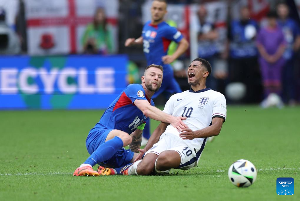 GELSENKIRCHEN, 1 julio, 2024 (Xinhua) -- Imagen del 30 de junio de 2024 de Milan Skriniar (i), de Eslovaquia, disputando el balón con Jude Bellingham, de Inglaterra, durante el partido correspondiente a los octavos de final de la EURO 2024 de la UEFA, entre Inglaterra y Eslovaquia, en Gelsenkirchen, Alemania. (Xinhua/Bai Xuefei)