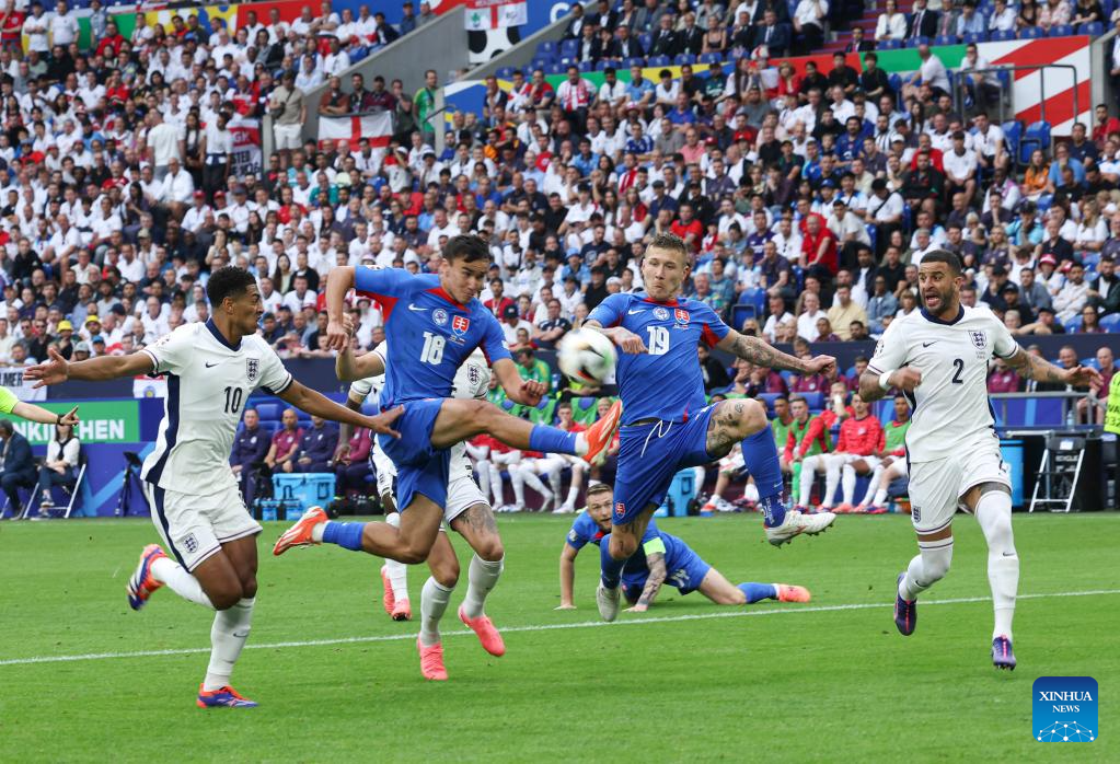 GELSENKIRCHEN, 1 julio, 2024 (Xinhua) -- Imagen del 30 de junio de 2024 de David Strelec (2-i), y Juraj Kucka (2-d), de Eslovaquia, compitiendo durante el partido correspondiente a los octavos de final de la EURO 2024 de la UEFA, entre Inglaterra y Eslovaquia, en Gelsenkirchen, Alemania. (Xinhua/Bai Xuefei)