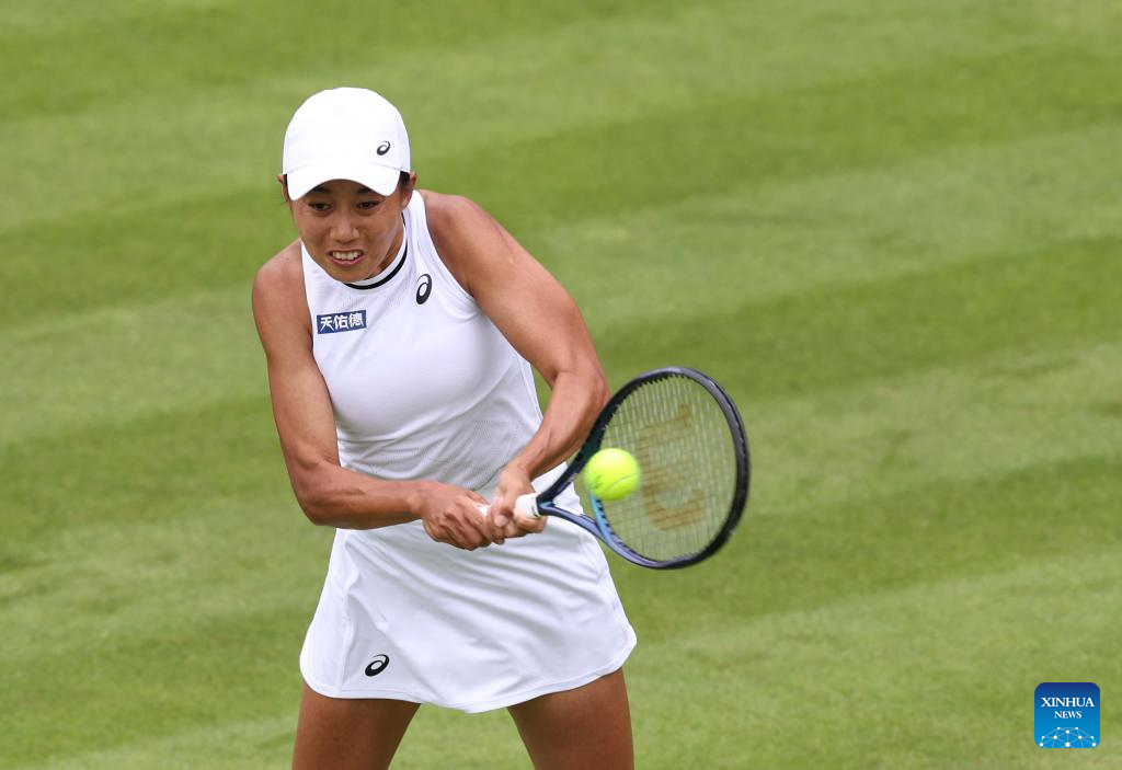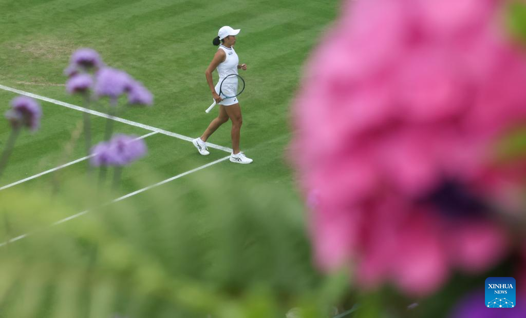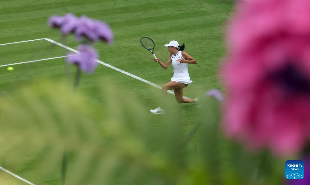 LONDRES, 1 julio, 2024 (Xinhua) -- Zhang Shuai compite durante el partido de la primera ronda de individuales femeninos entre Zhang Shuai, de China, y Daria Kasatkina, de Rusia, en el Campeonato de Tenis de Wimbledon, en Londres, Reino Unido, el 1 de julio de 2024. (Xinhua/Han Yan)