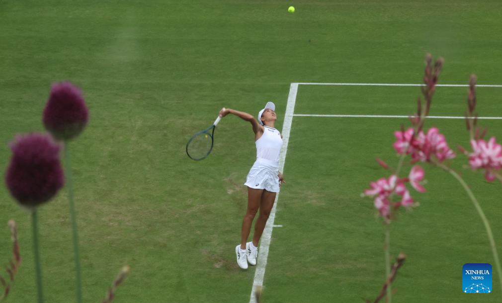 LONDRES, 1 julio, 2024 (Xinhua) -- Zhang Shuai sirve la pelota durante el partido de la primera ronda de individuales femeninos entre Zhang Shuai, de China, y Daria Kasatkina, de Rusia, en el Campeonato de Tenis de Wimbledon, en Londres, Reino Unido, el 1 de julio de 2024. (Xinhua/Han Yan)