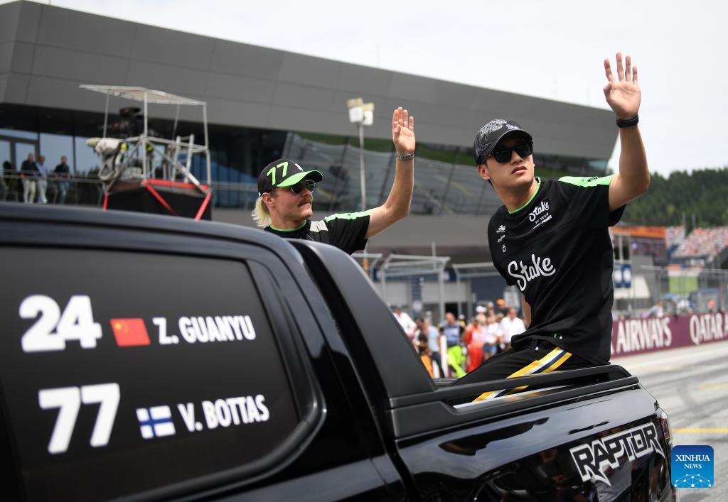 SPIELBERG, 1 julio, 2024 (Xinhua) -- Imagen del 30 de junio de 2024 del piloto chino de la escudería Kick Sauber, Zhou Guanyu (d), asistiendo al desfile de pilotos previo a la carrera del Gran Premio de Austria de Fórmula 1, en Spielberg, Austria. (Xinhua/He Canling)