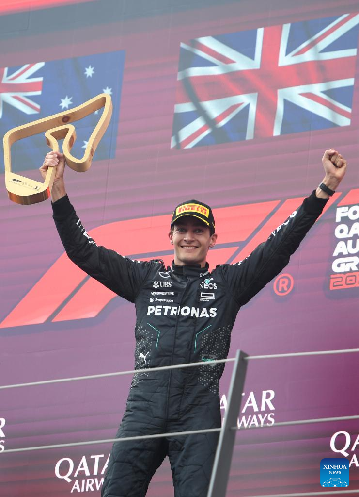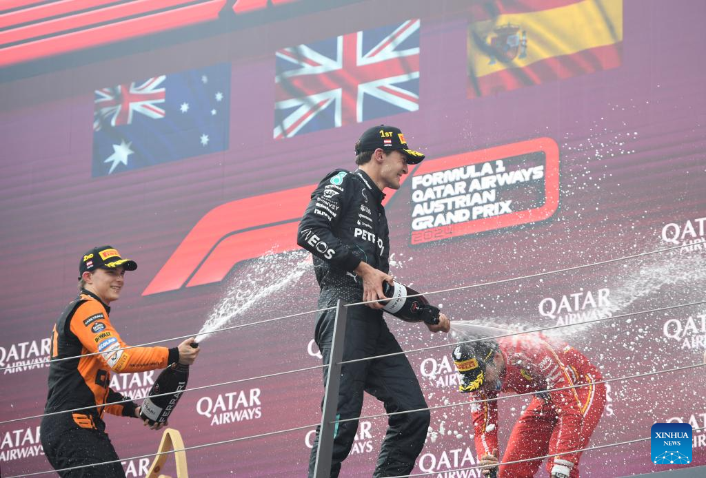 SPIELBERG, 1 julio, 2024 (Xinhua) -- Imagen del 30 de junio de 2024 del piloto británico de la escudería Mercedes, George Russell, ganador del primer lugar, festejando durante la ceremonia de premiación de la carrera del Gran Premio de Austria de Fórmula 1, en Spielberg, Austria. (Xinhua/He Canling)