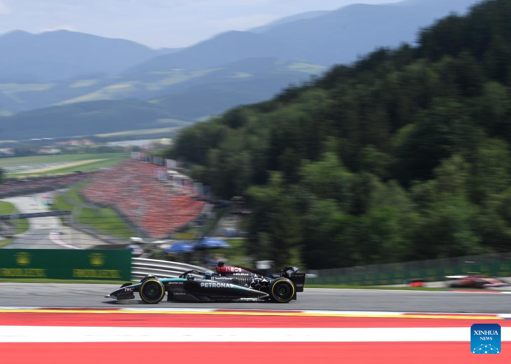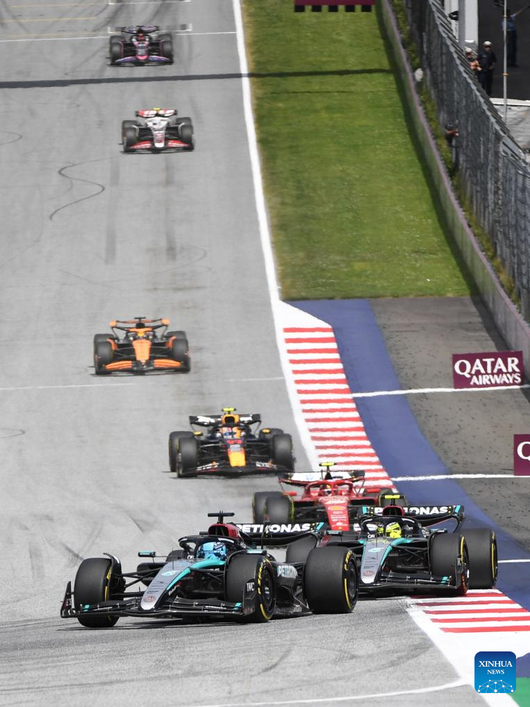 SPIELBERG, 1 julio, 2024 (Xinhua) -- Imagen del 30 de junio de 2024 del piloto británico de la escudería Mercedes, George Russell (frente), compitiendo durante la carrera del Gran Premio de Austria de Fórmula 1, en Spielberg, Austria. (Xinhua/He Canling)